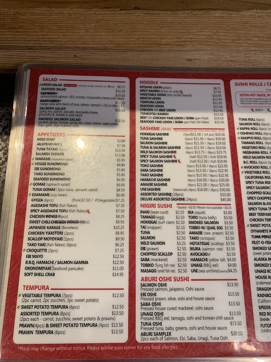 Green Salad, Chicken Karage, Tempura Udon, Assorted Sushi